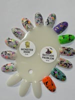 A clear base packed with neon glitter, black glitter (bats, stars, hearts and if you are lucky enough you'll find skulls)