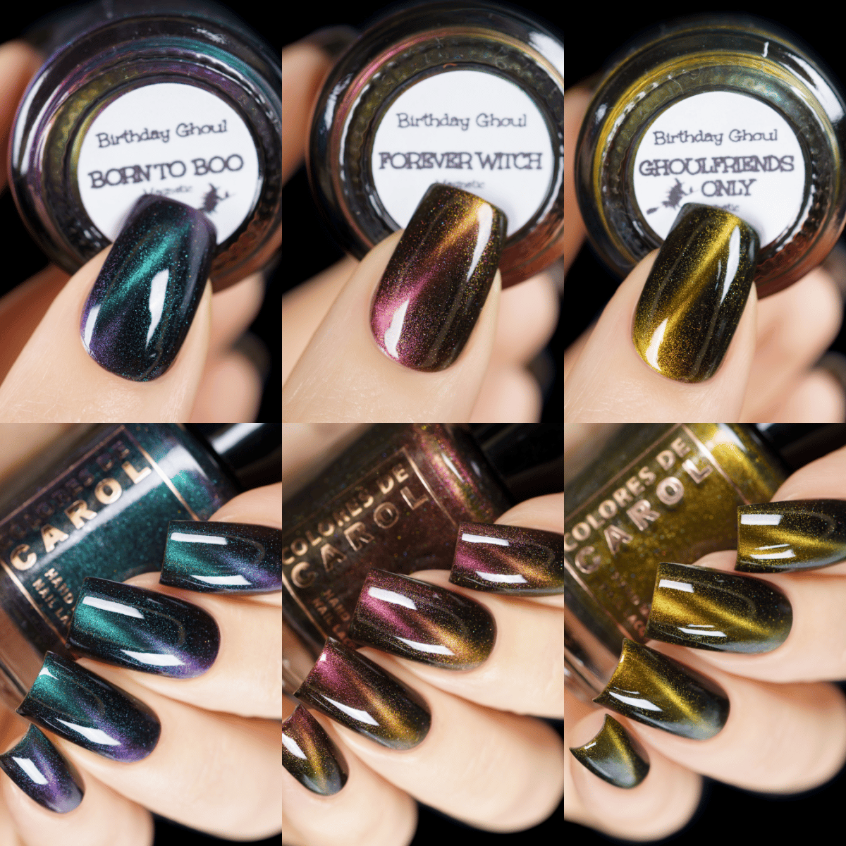 🖤BORN TO BOO, a black crelly with holo dust and blue/green/purple multichrome magnetic effect.
