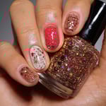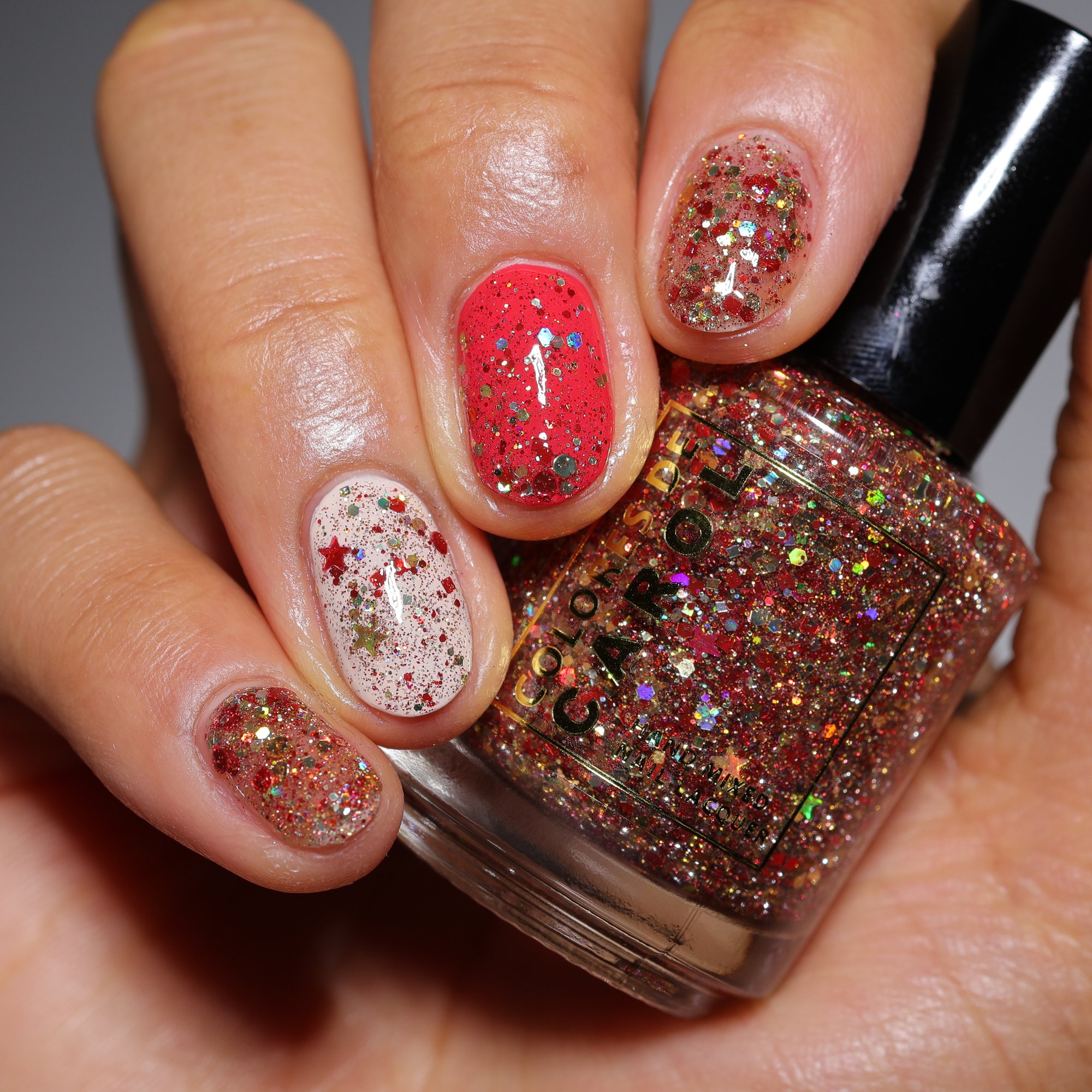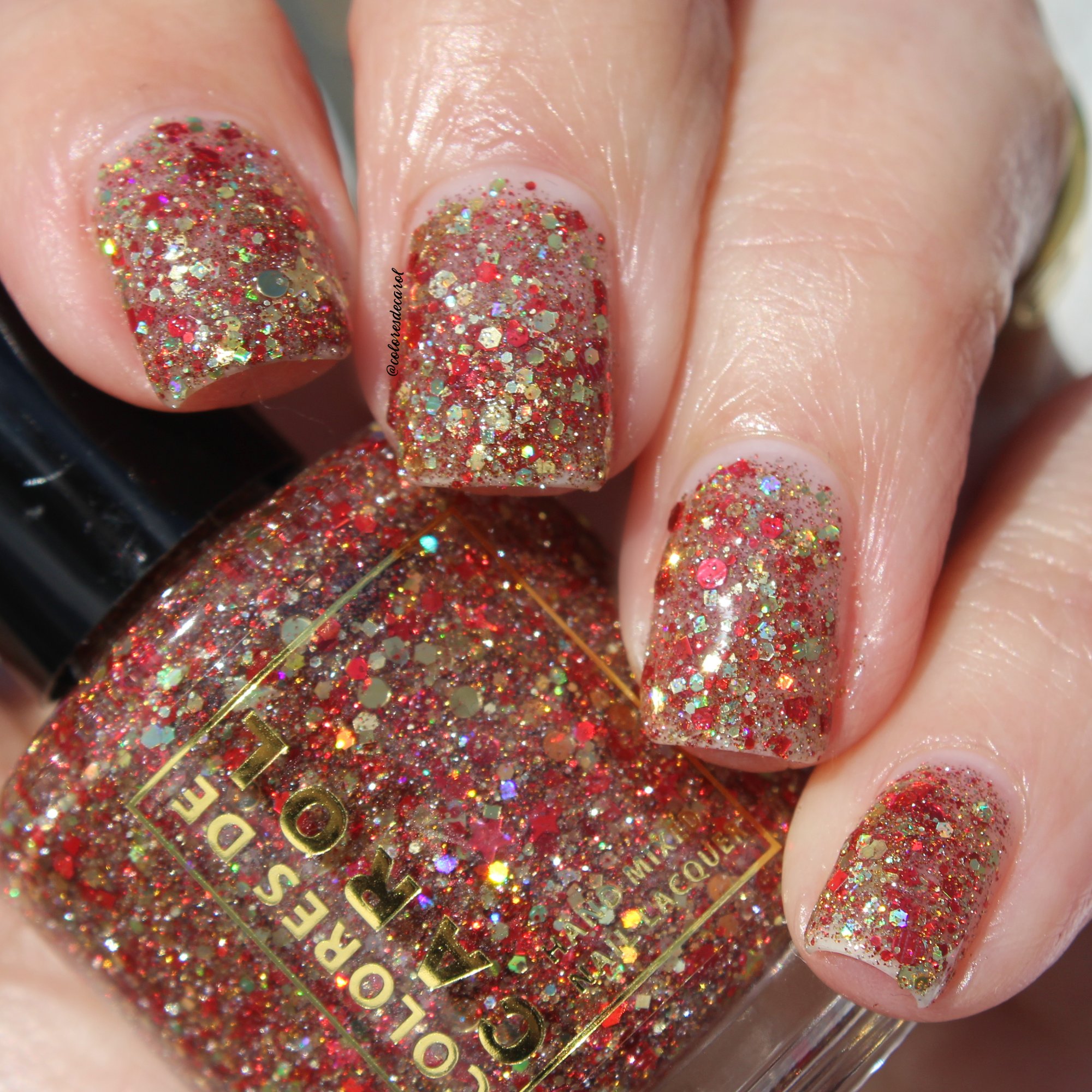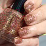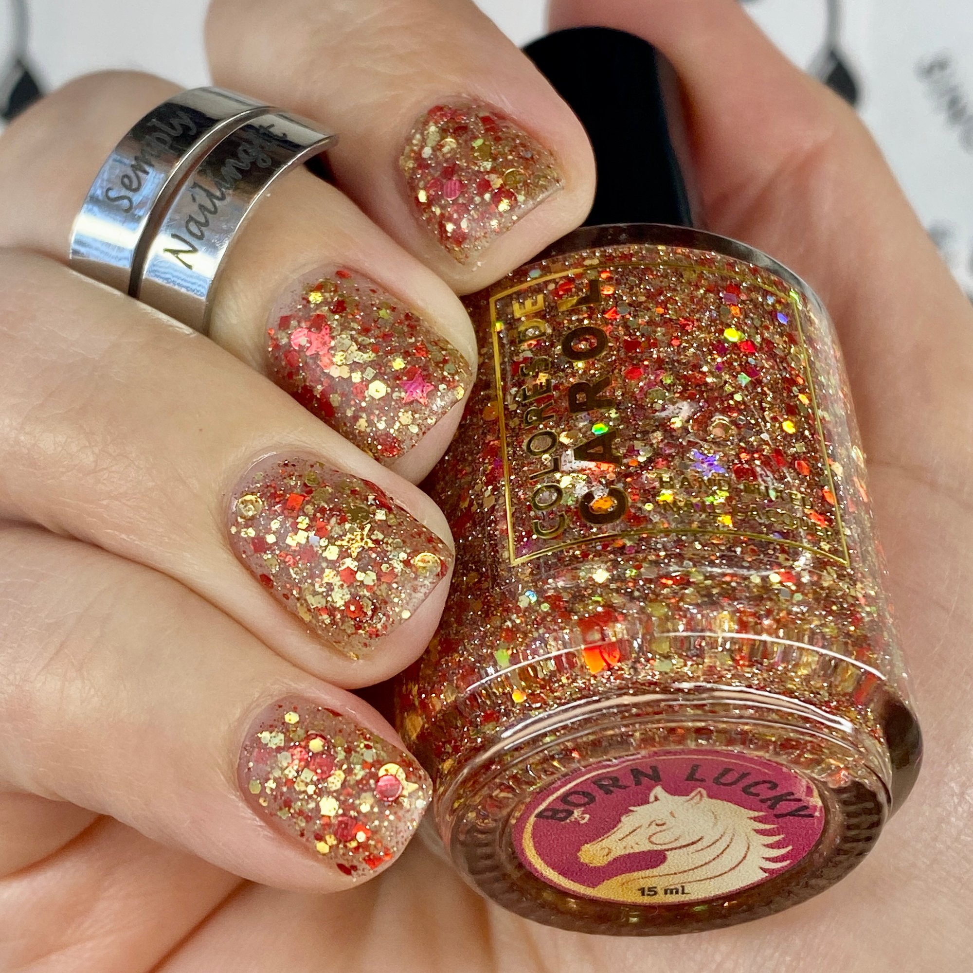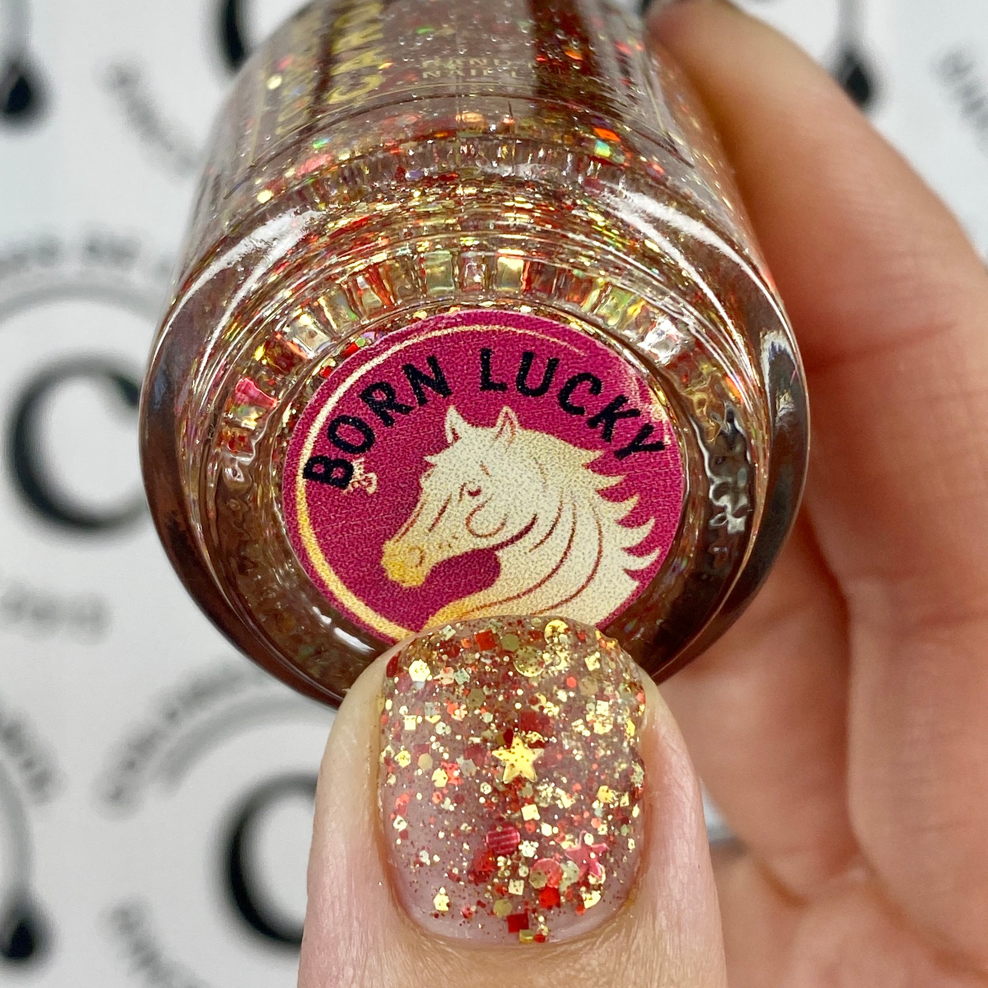 Born Lucky is a clear base packed with gold and red glitters is varios shapes and sizes including holographic and reflective.