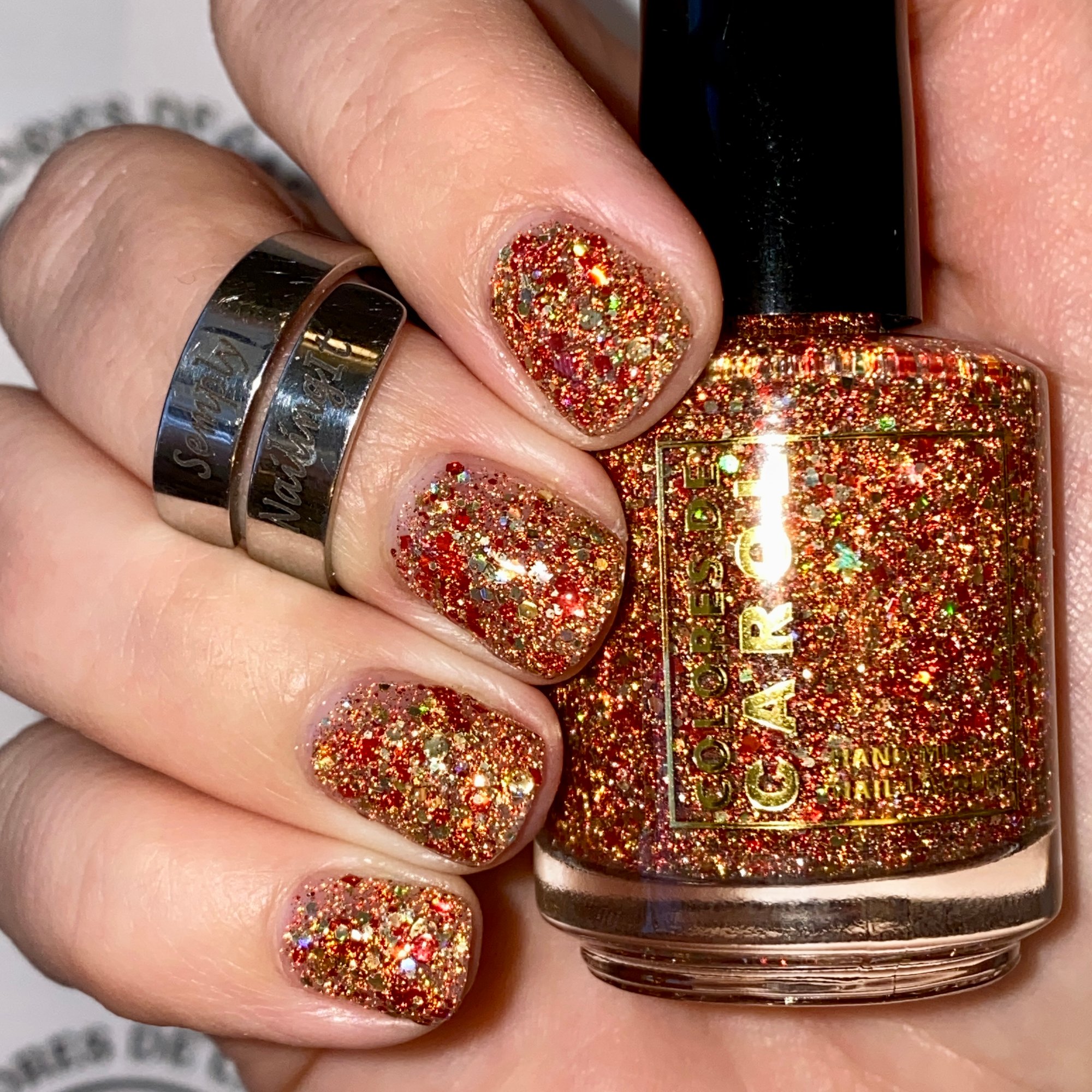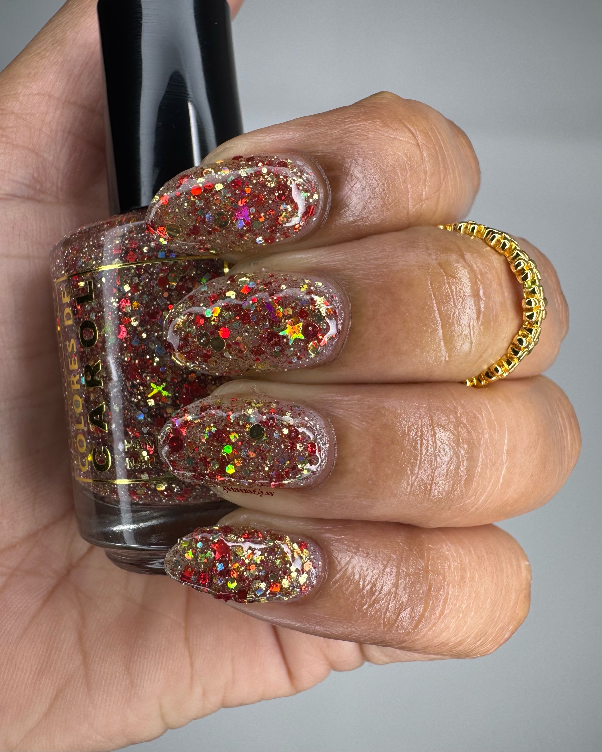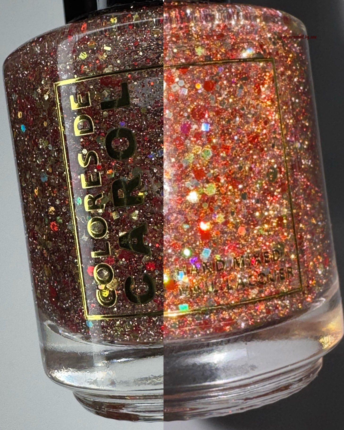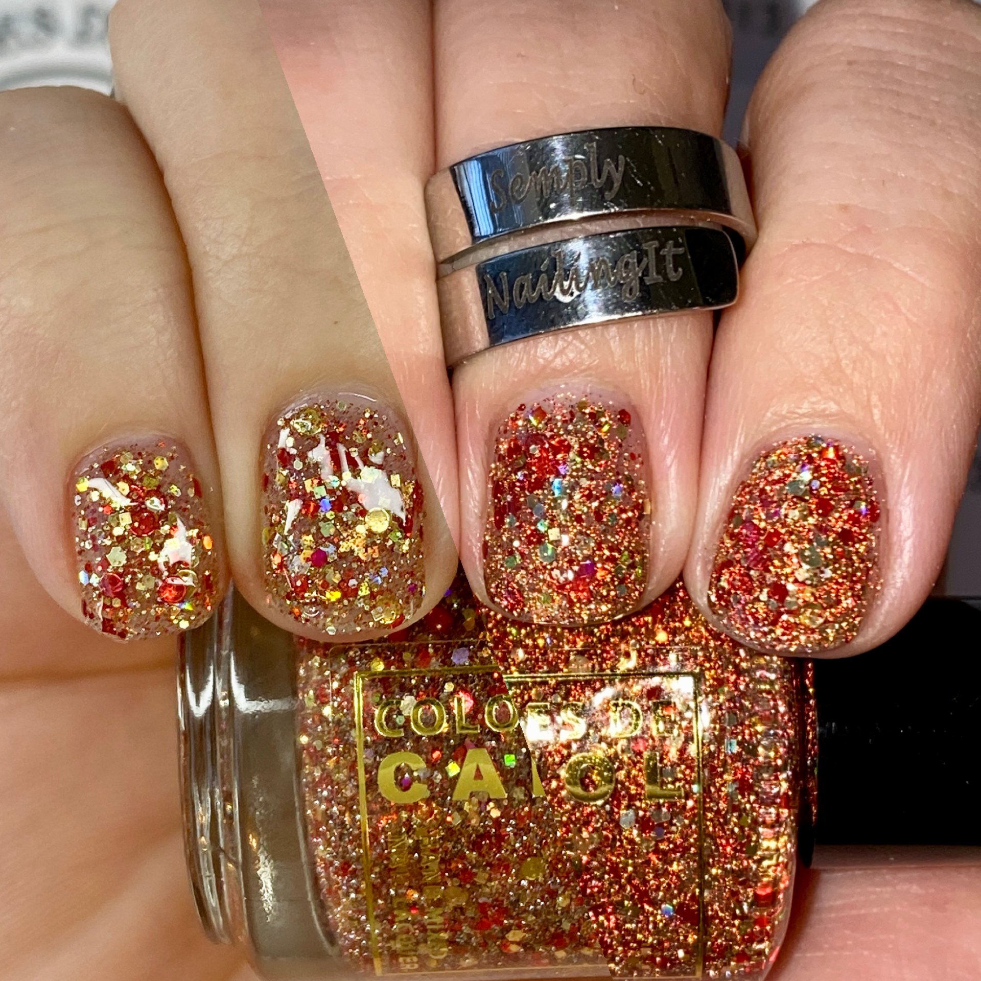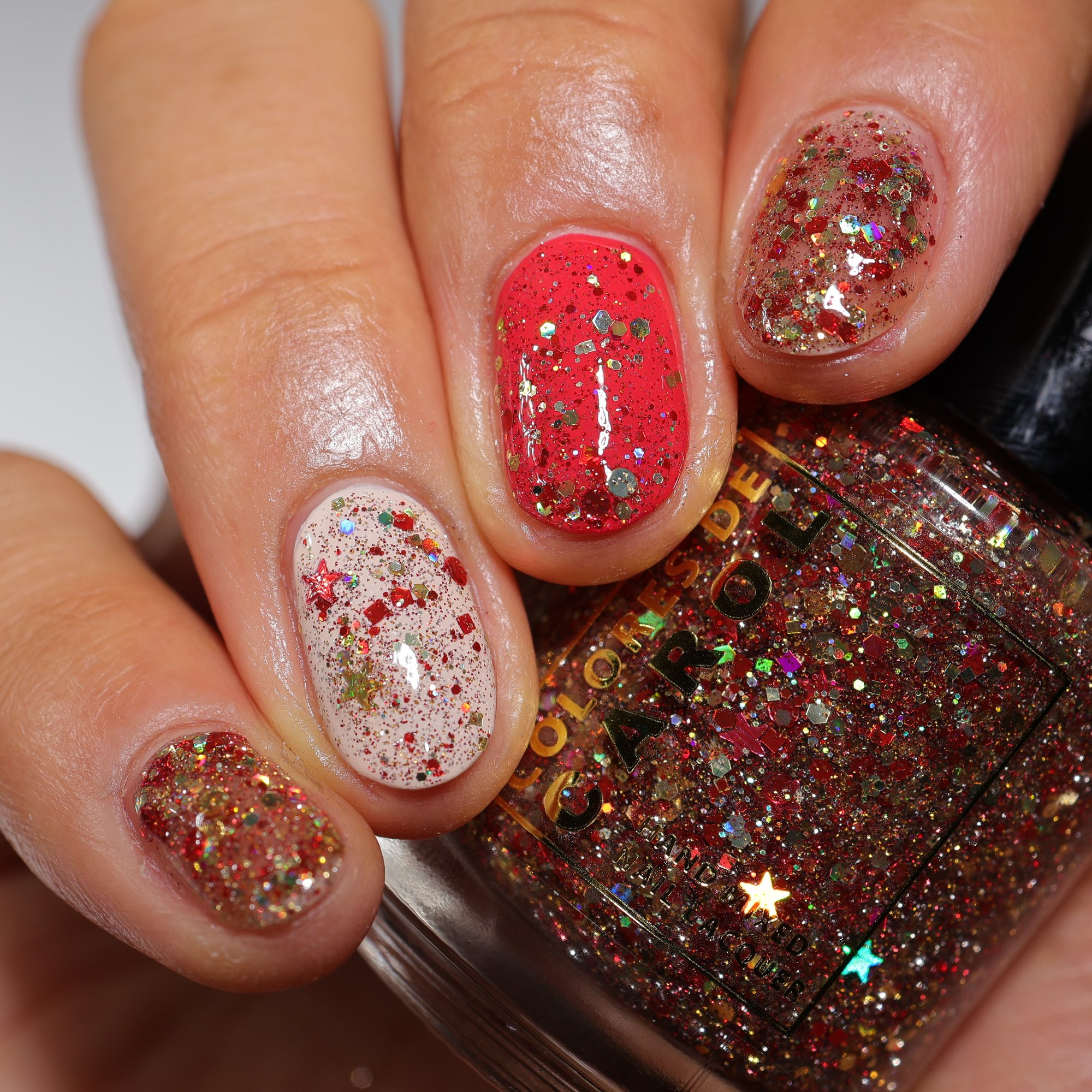Born Lucky is a clear base packed with gold and red glitters is varios shapes and sizes including holographic and reflective.