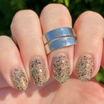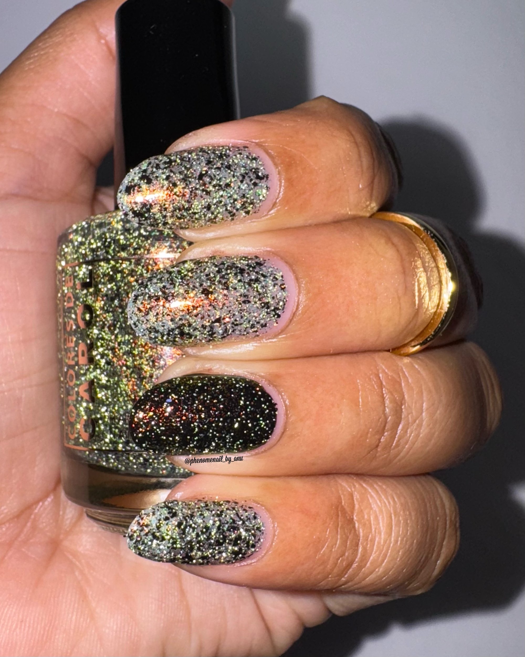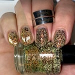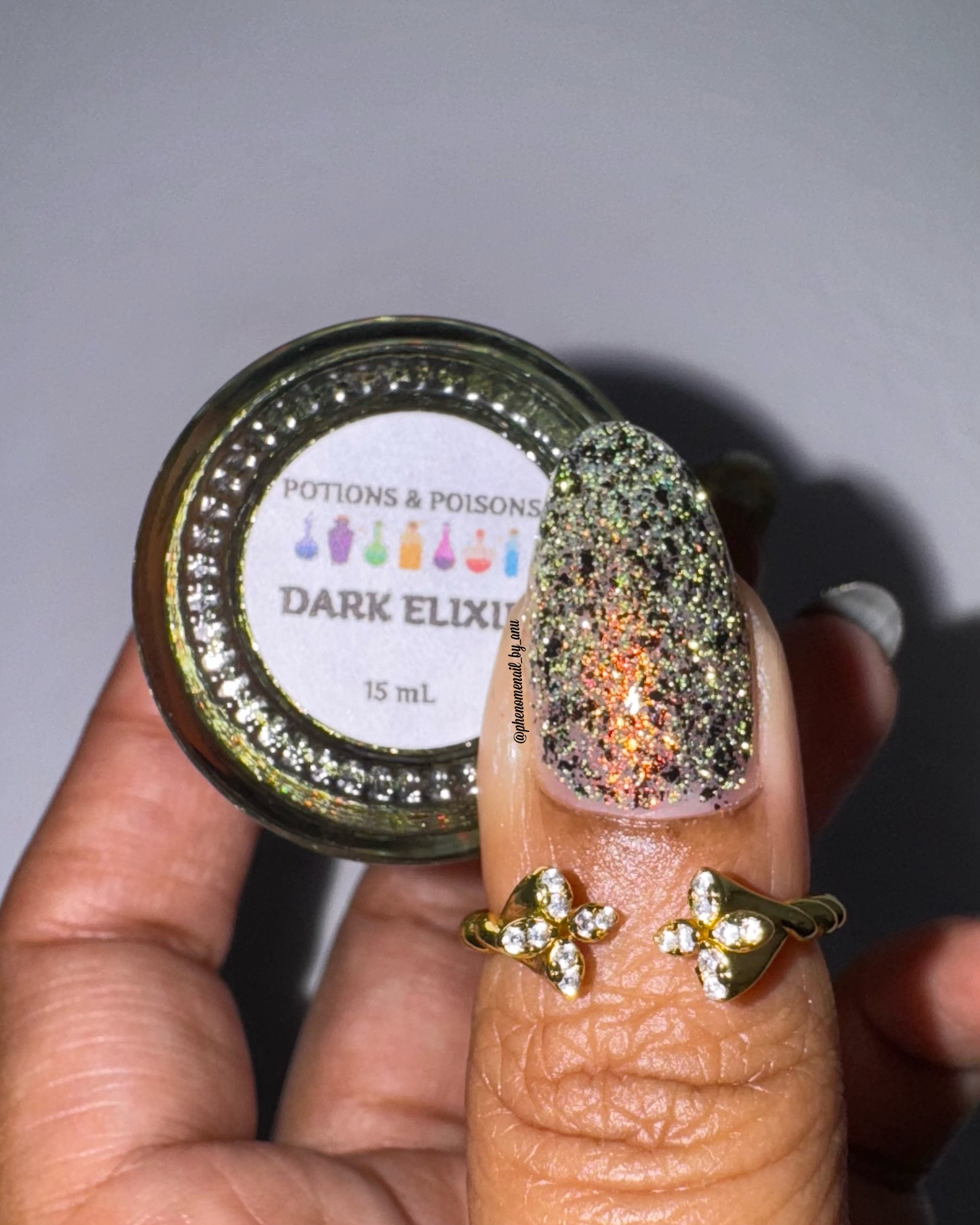 DARK ELIXIR, a full coverage color shifting reflective glitter (gold/orange/green) and black micro flakes.