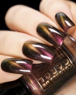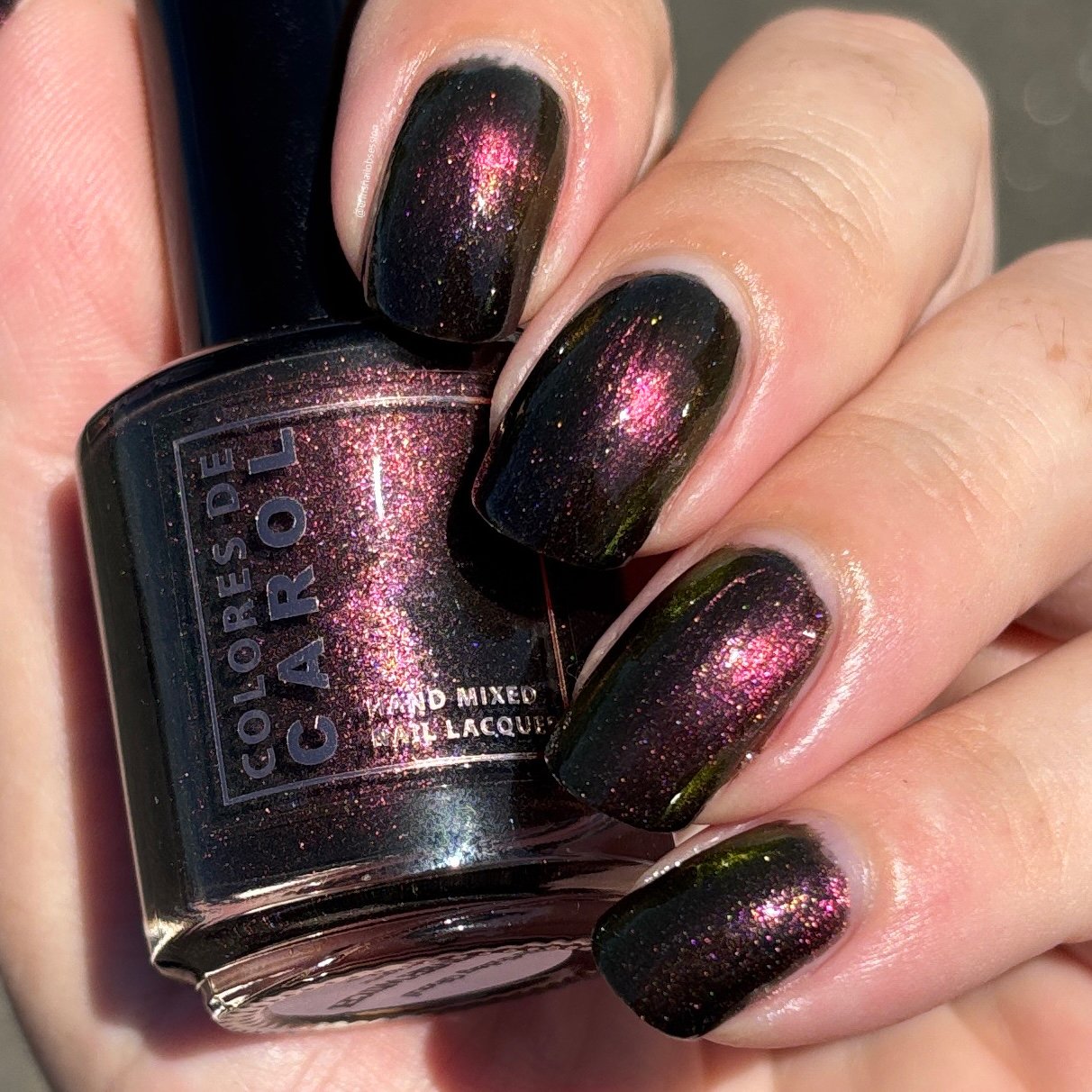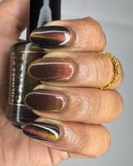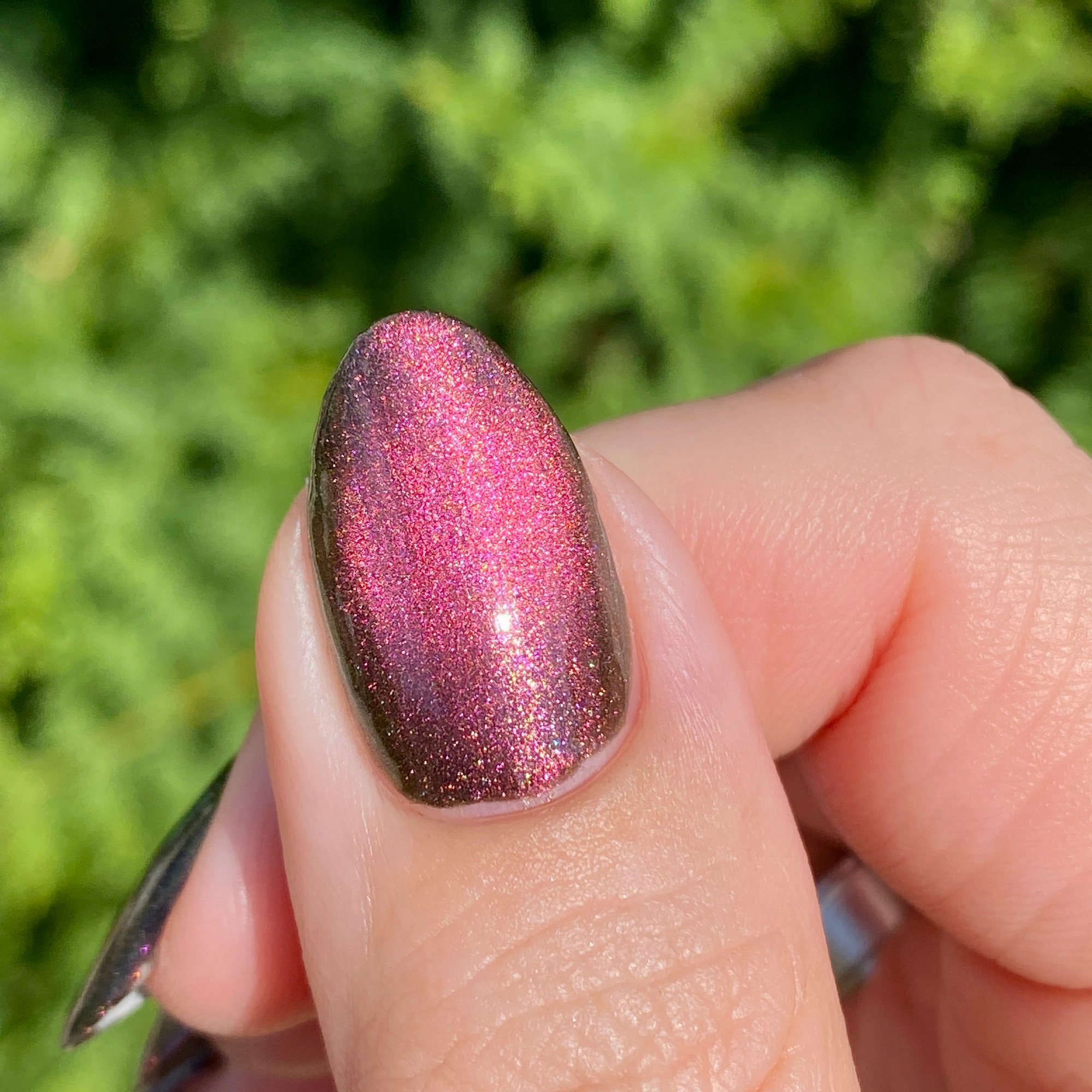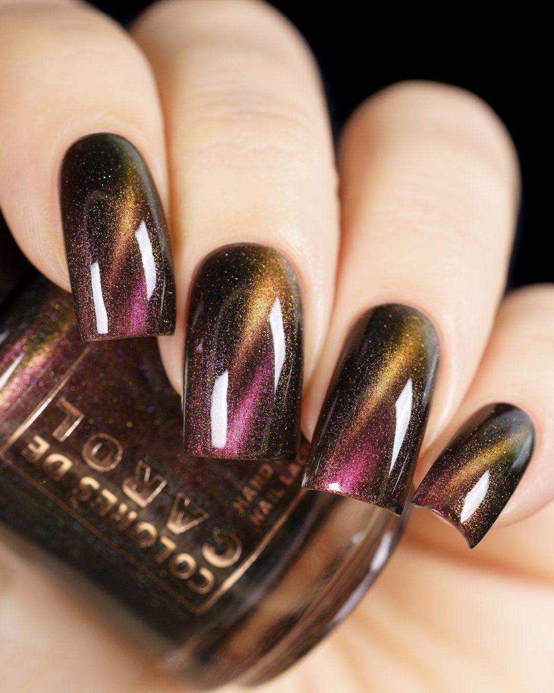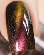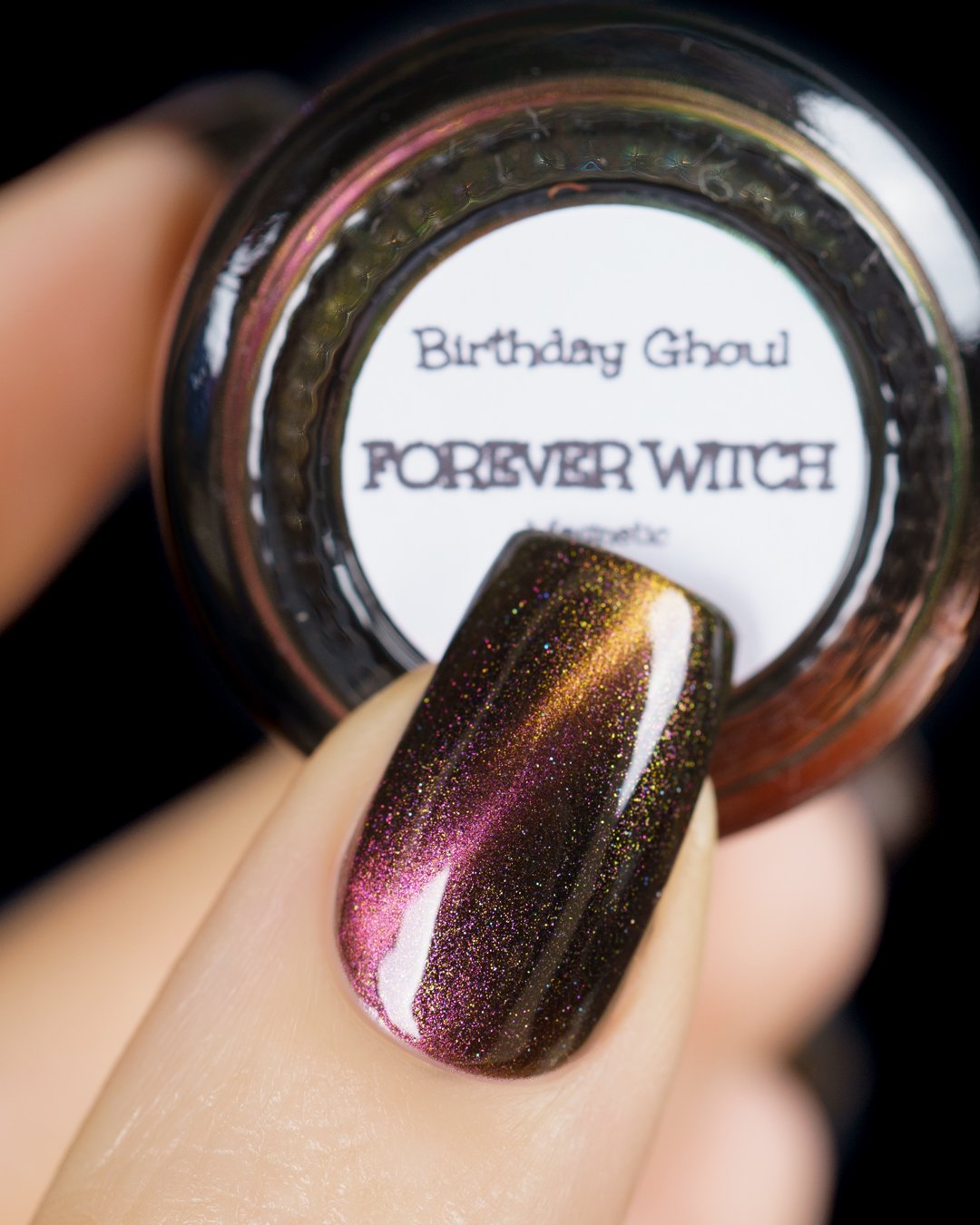Forever Witch, a black crelly with holo dust and gold/orange/red shifting multichrome magnetic effect.