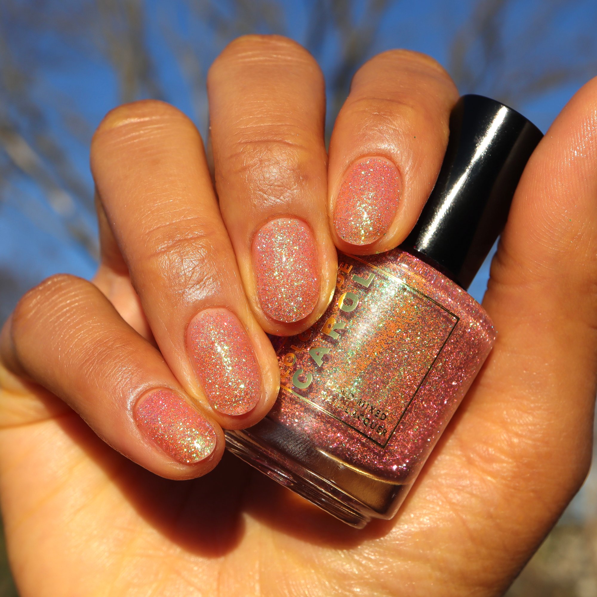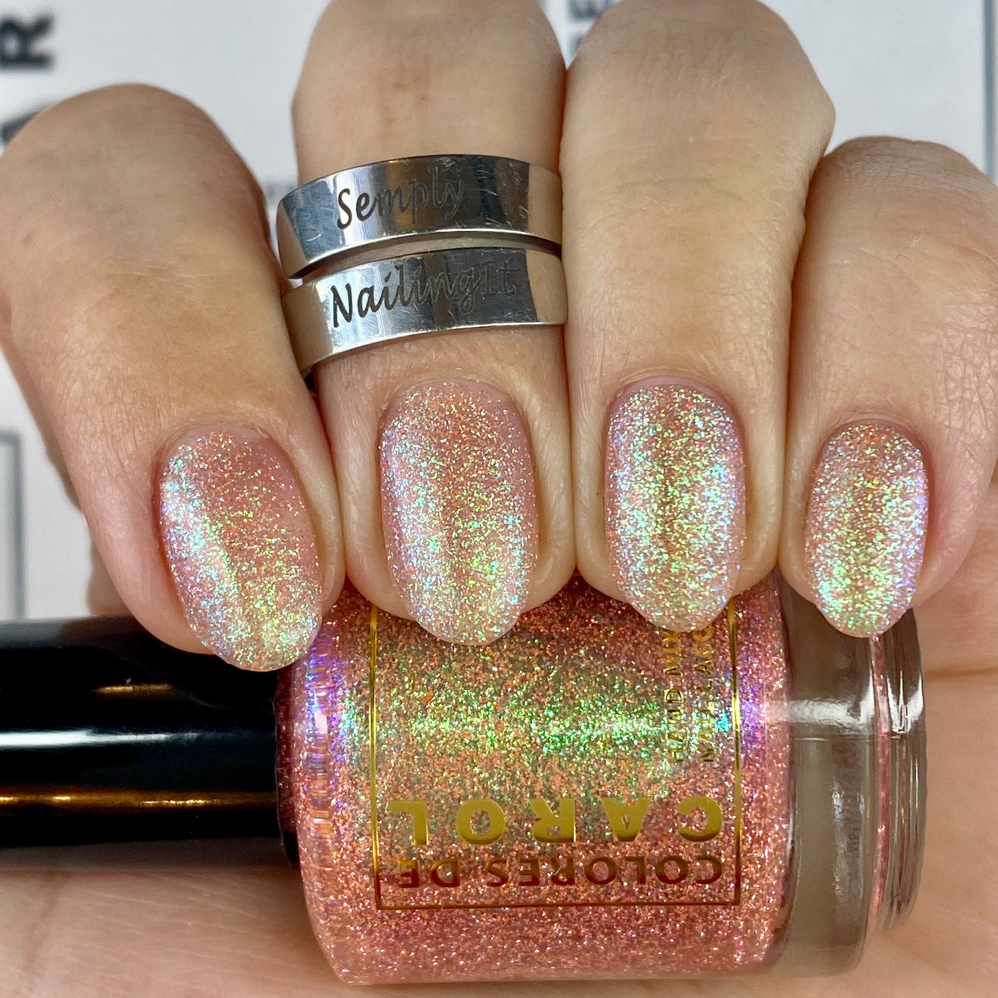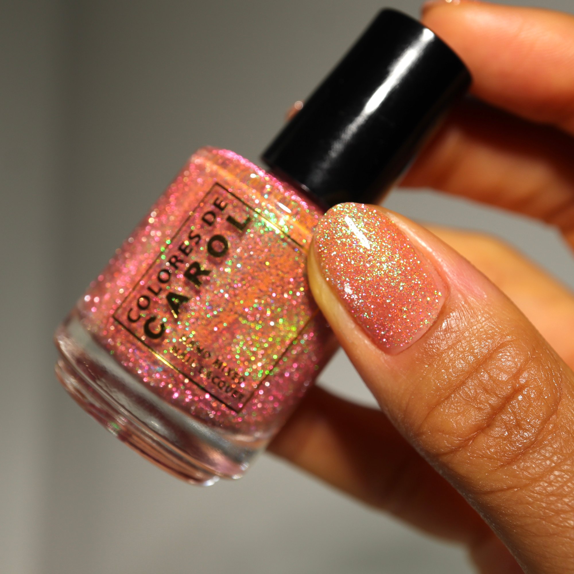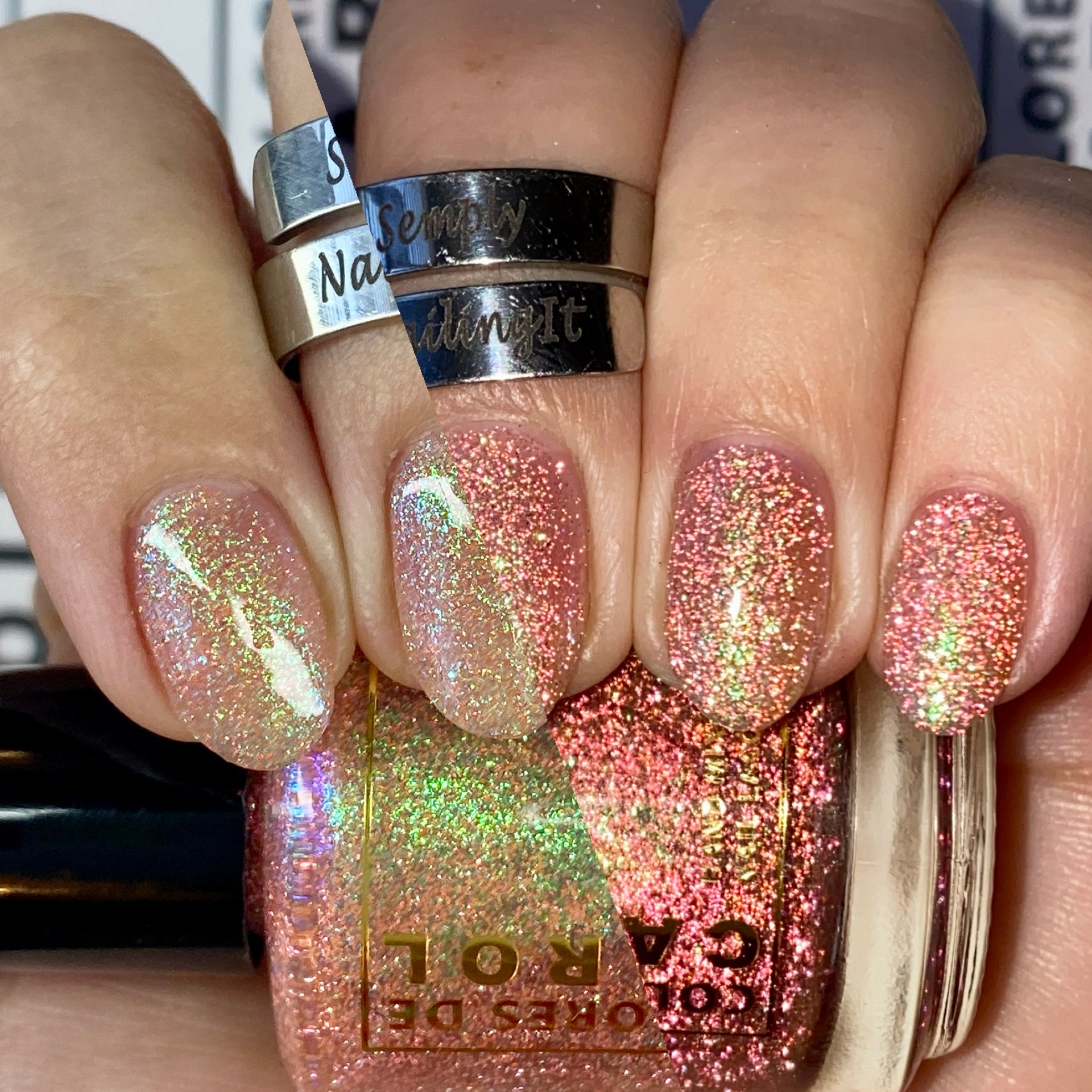 GLOW BIG OR GLOW HOME, (reflective) apricot pink reflective glitter with aqua/purple/green shifting flakes.
