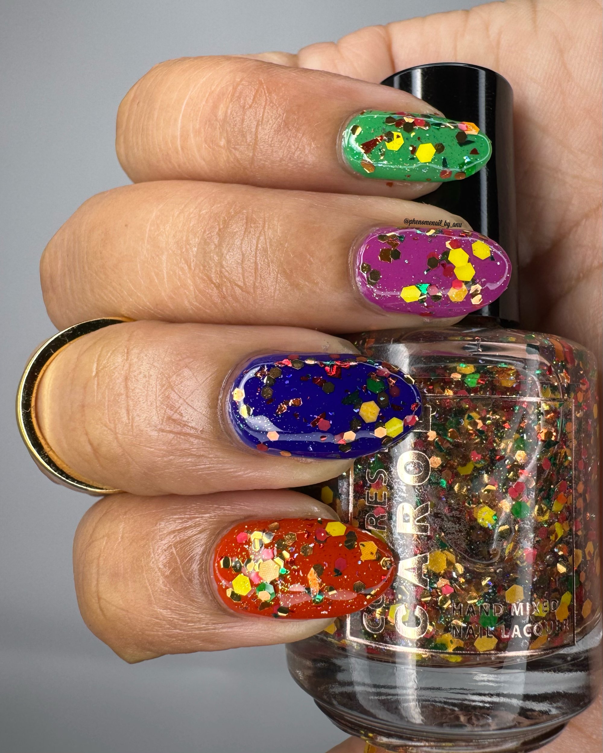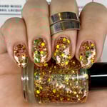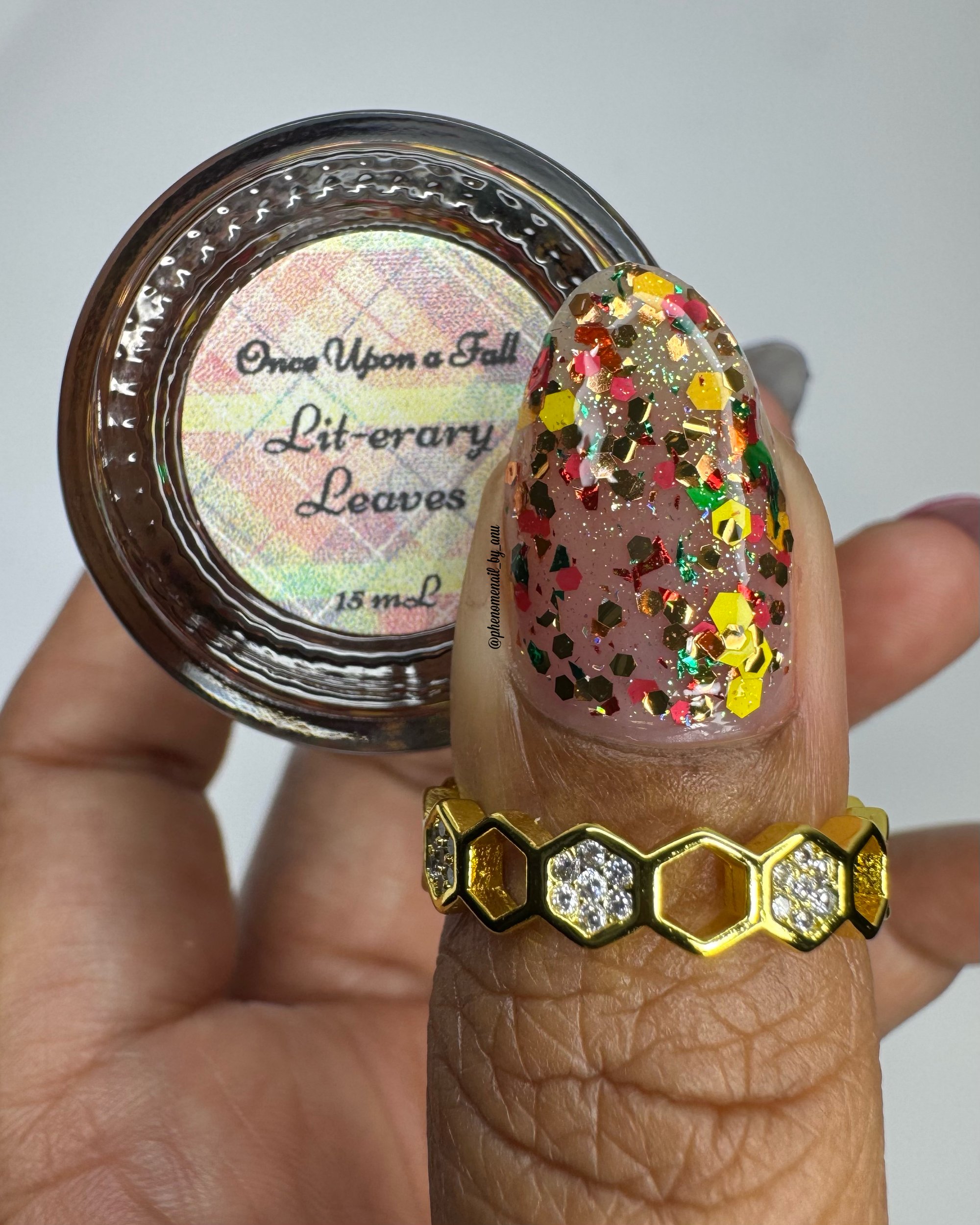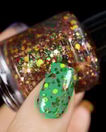 Lit-eray Leaves (Limited Edition) a clear base packed with yellow, orange, green, copper and caramel glitter and flakes and a subtle shifting shimmer.