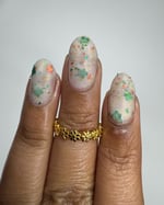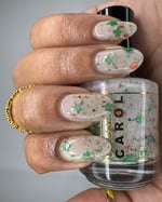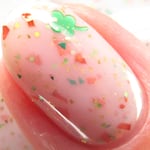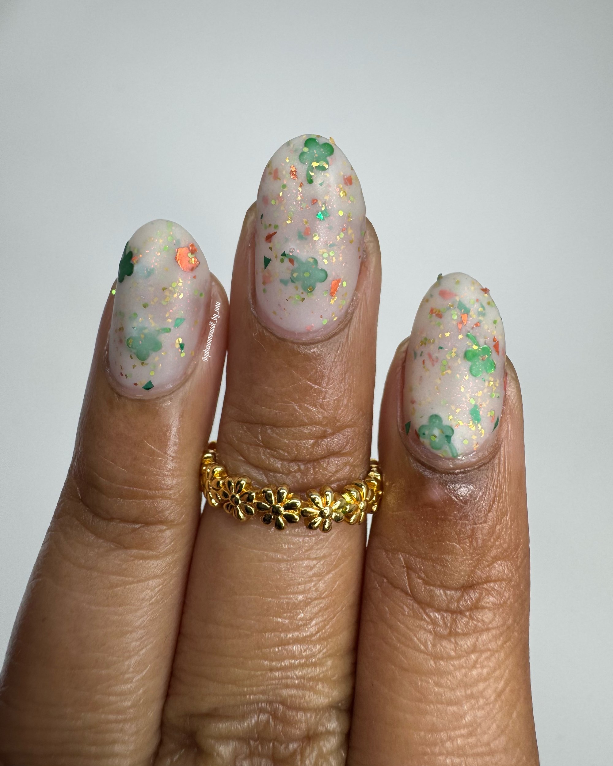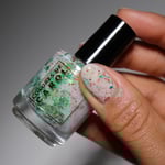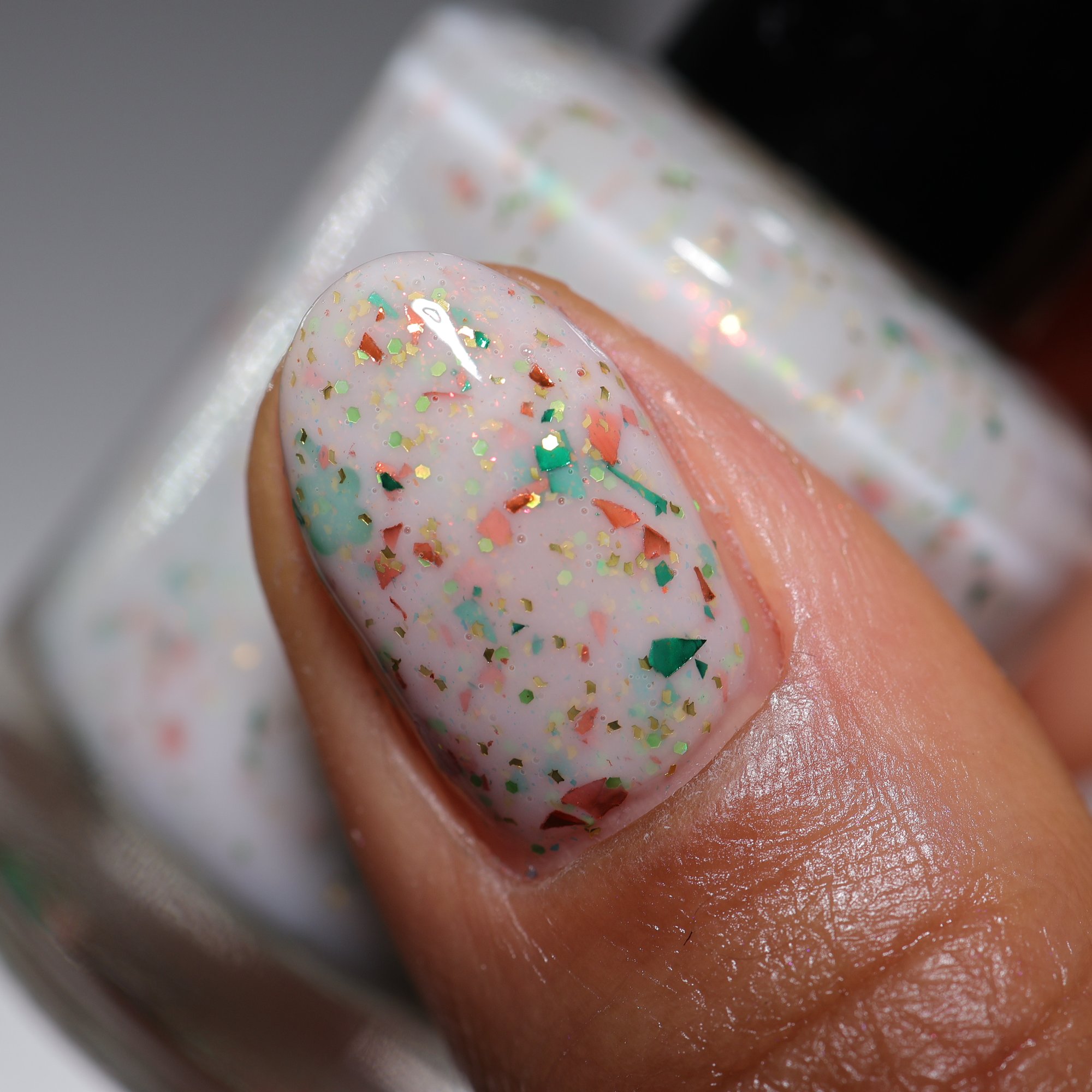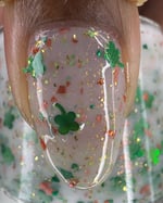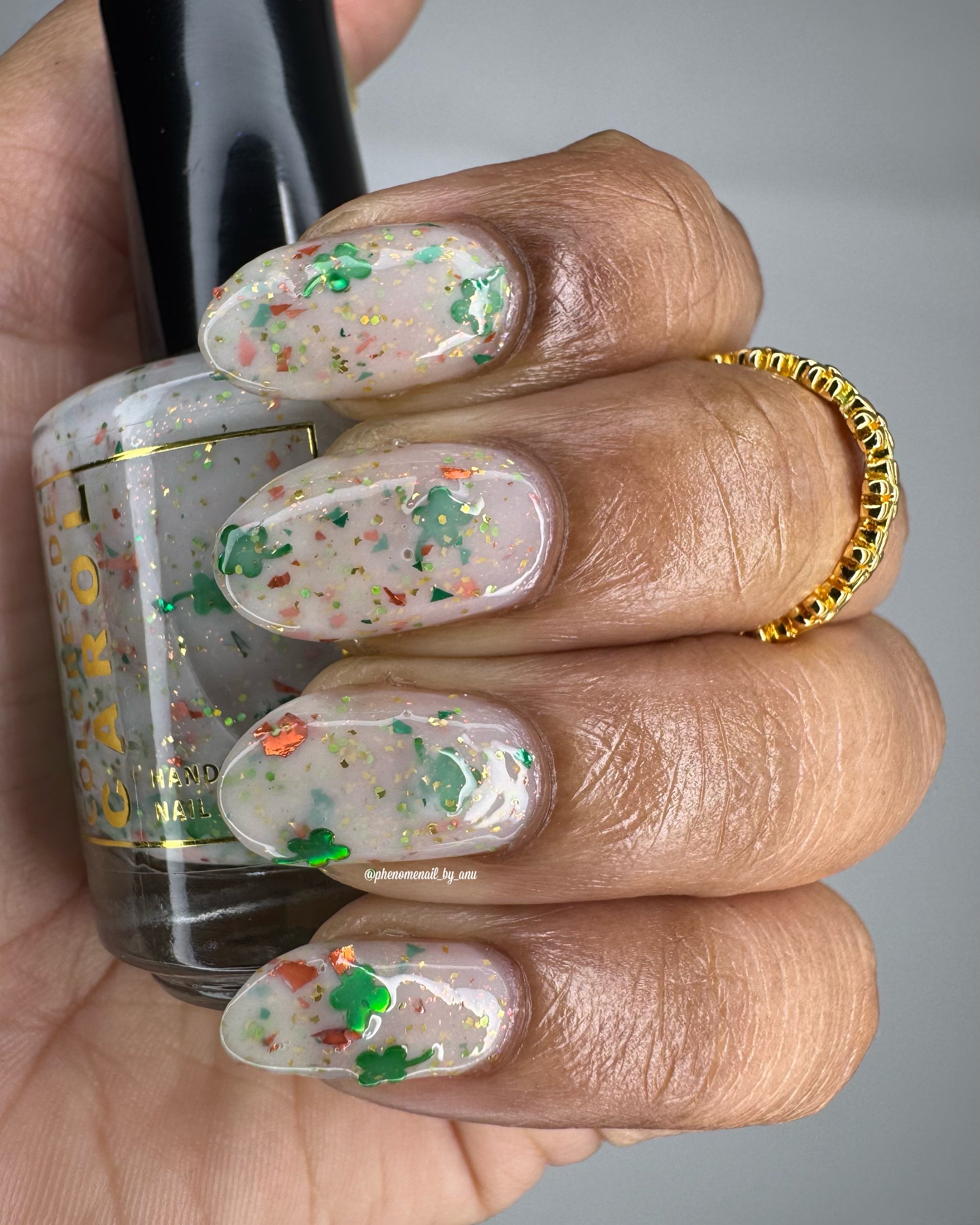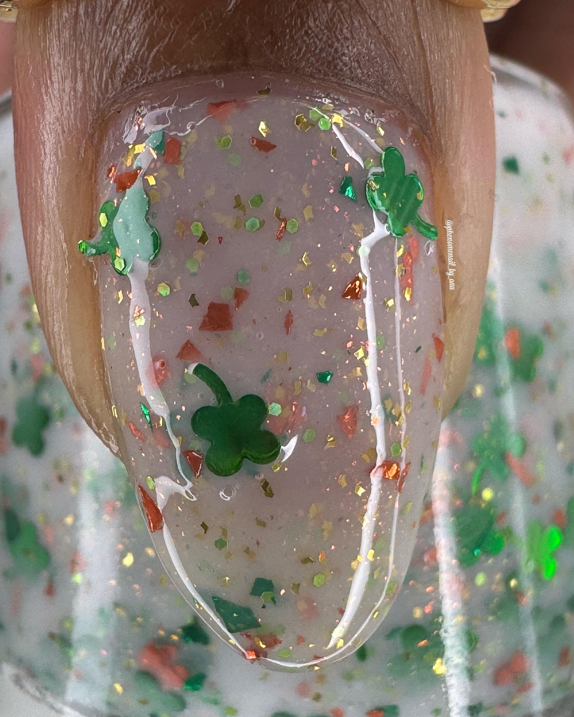 Lucky You, Lucky Me, a white crelly with shifting shimmery micro flakes (gold/orange/red), emerald, gold and orange shreds, lime micro glitter and green holo clovers.