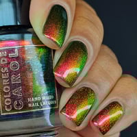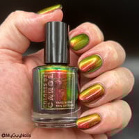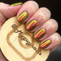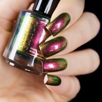 Party Like it’s 2013, an intense multi chrome nail polish that transitions between hues of red, pink, gold, green, aqua and purple depending on the angle of light or perspective.