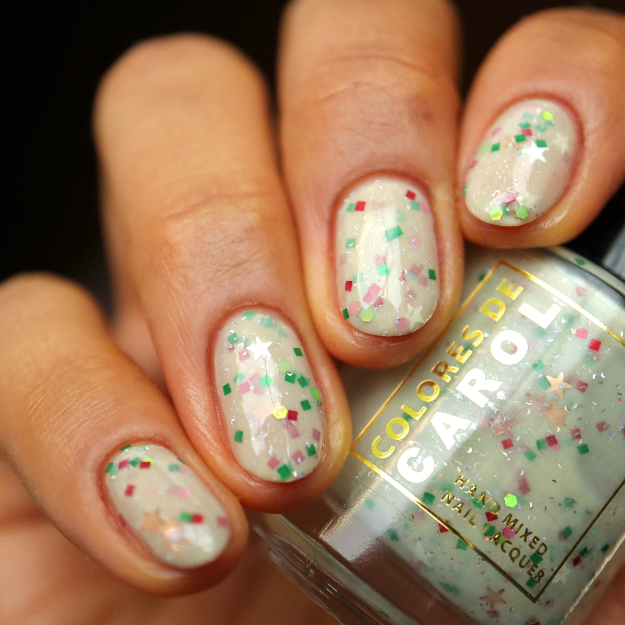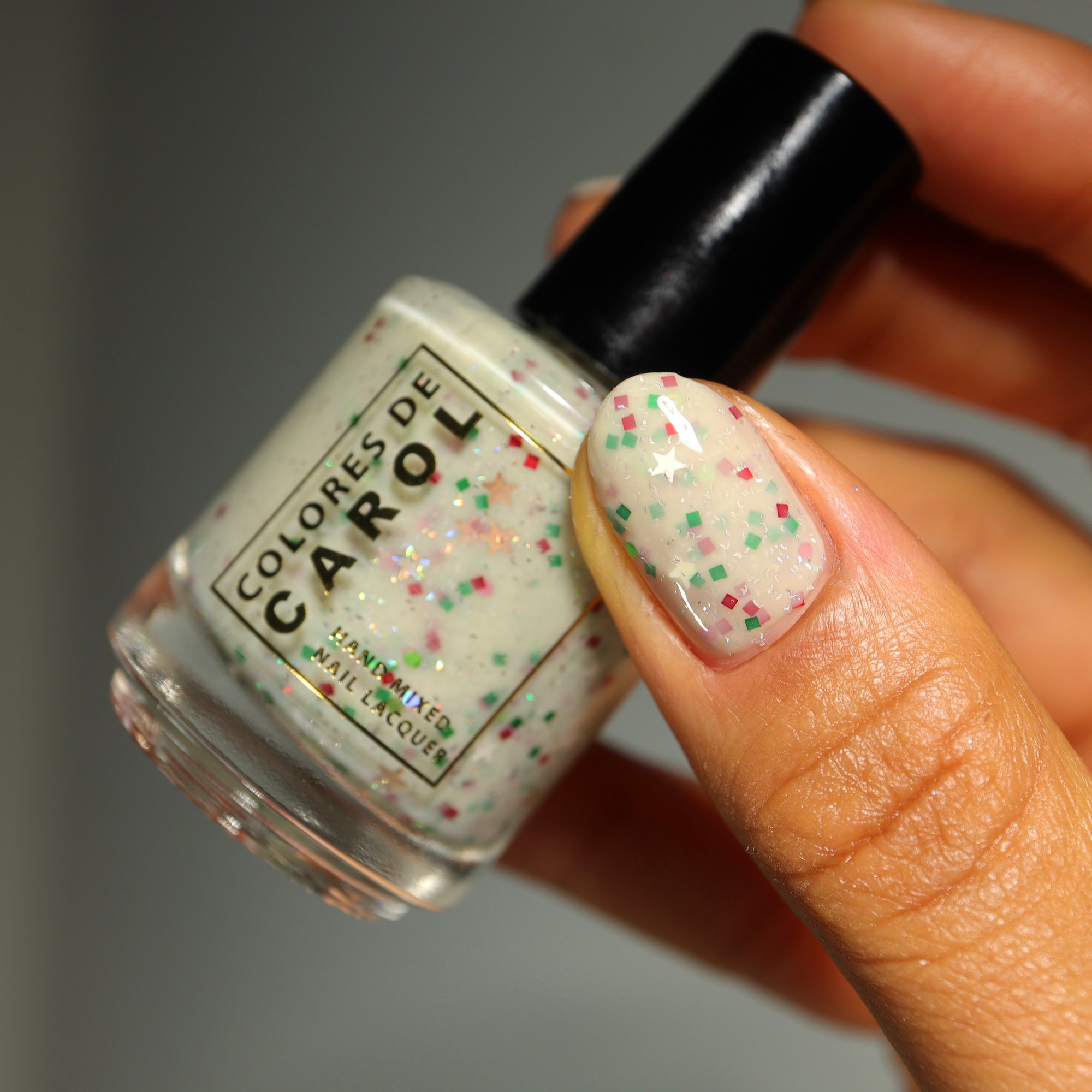 PLANETARY CRUSH, a soft yellowish beige glitter crelly with gold and white mini stars, red and green square glitters, chameleon holo glitter and silver holo shreds.