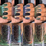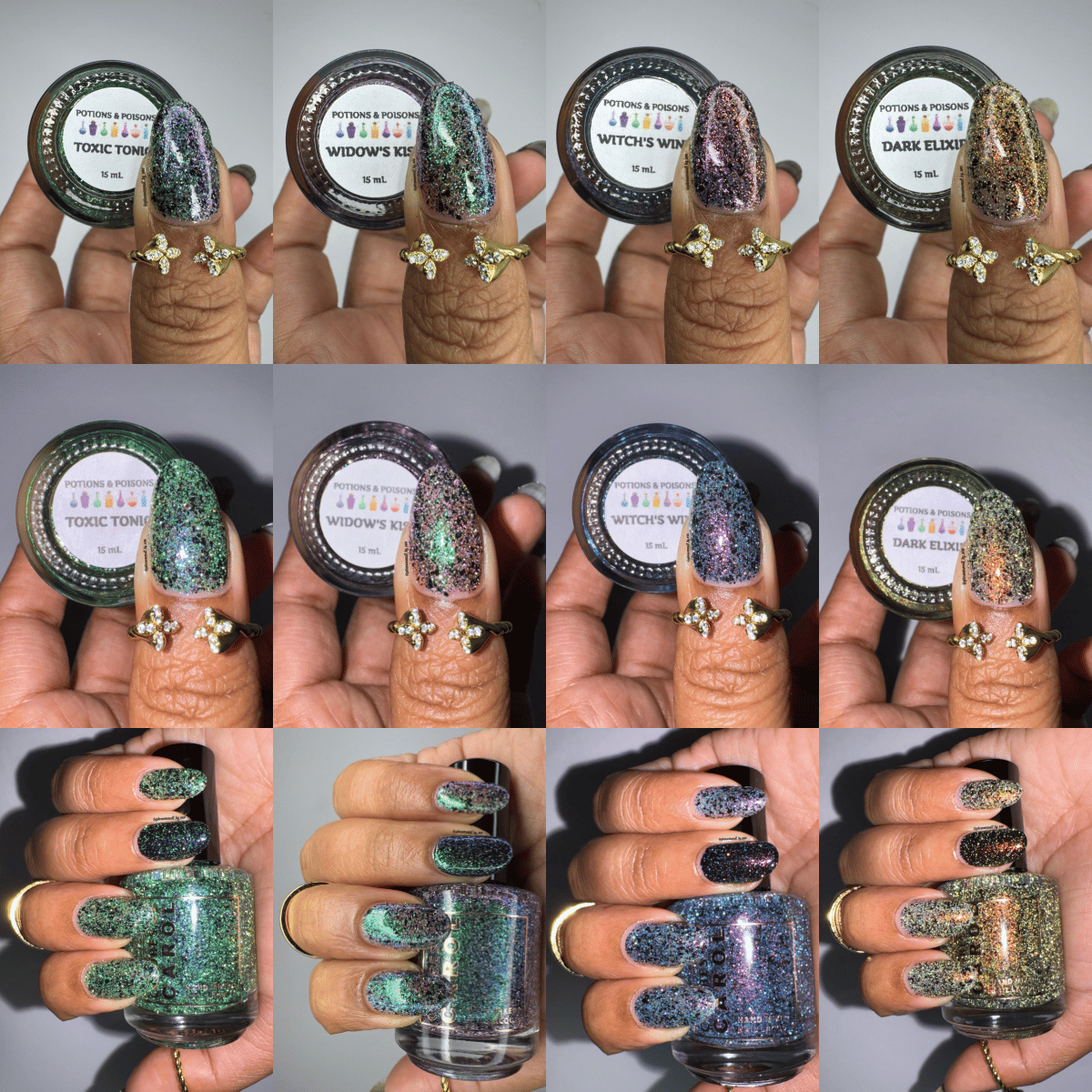 WITCH’S WINE, a full coverage color shifting reflective glitter (blue/pink/green) and black micro flakes.