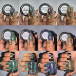 DARK ELIXIR, a full coverage color shifting reflective glitter (gold/orange/green) and black micro flakes.