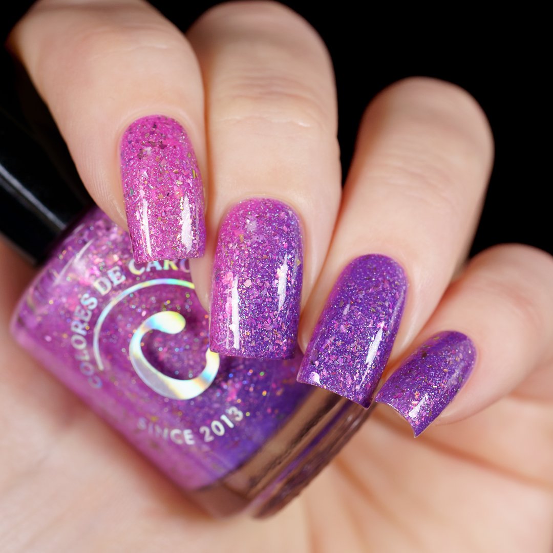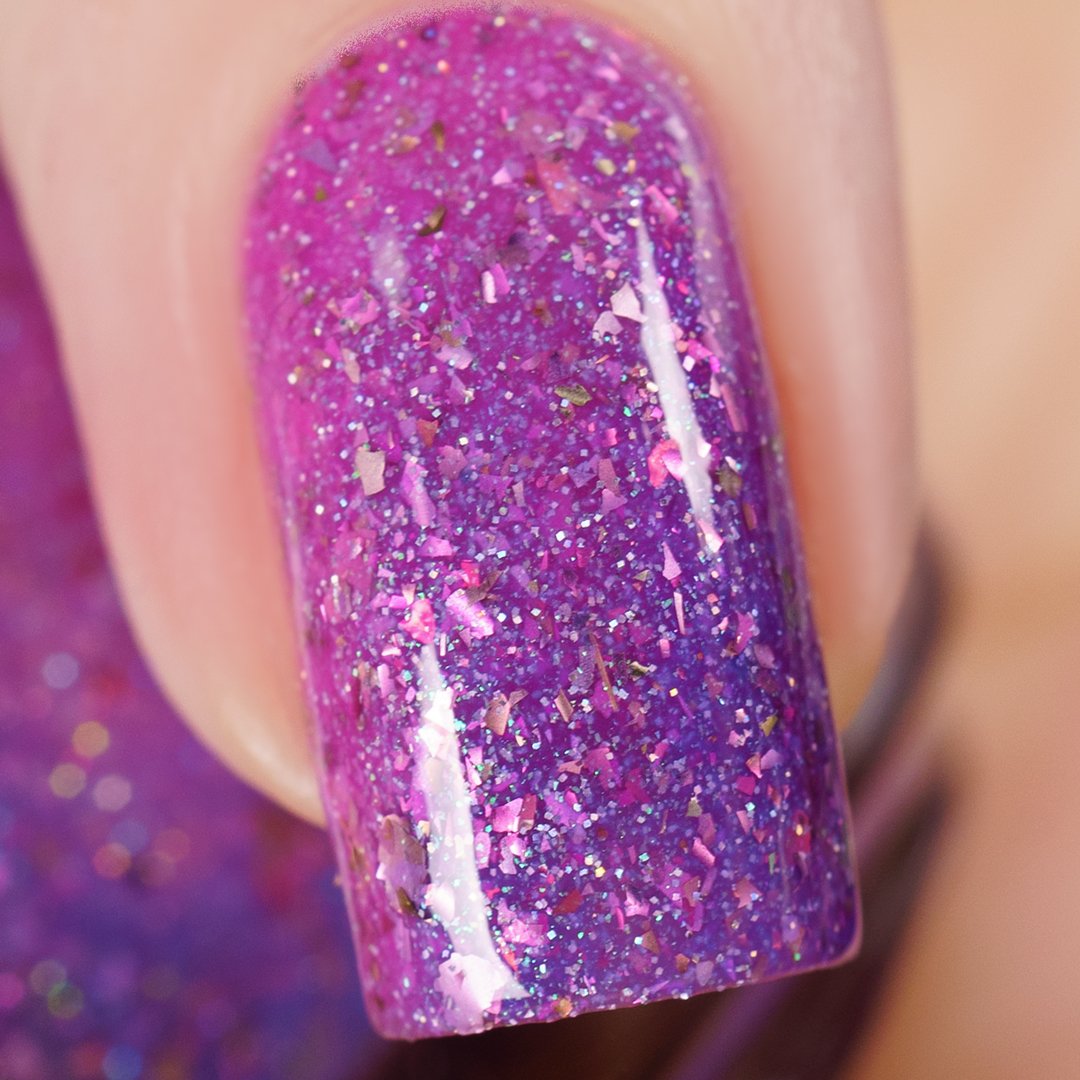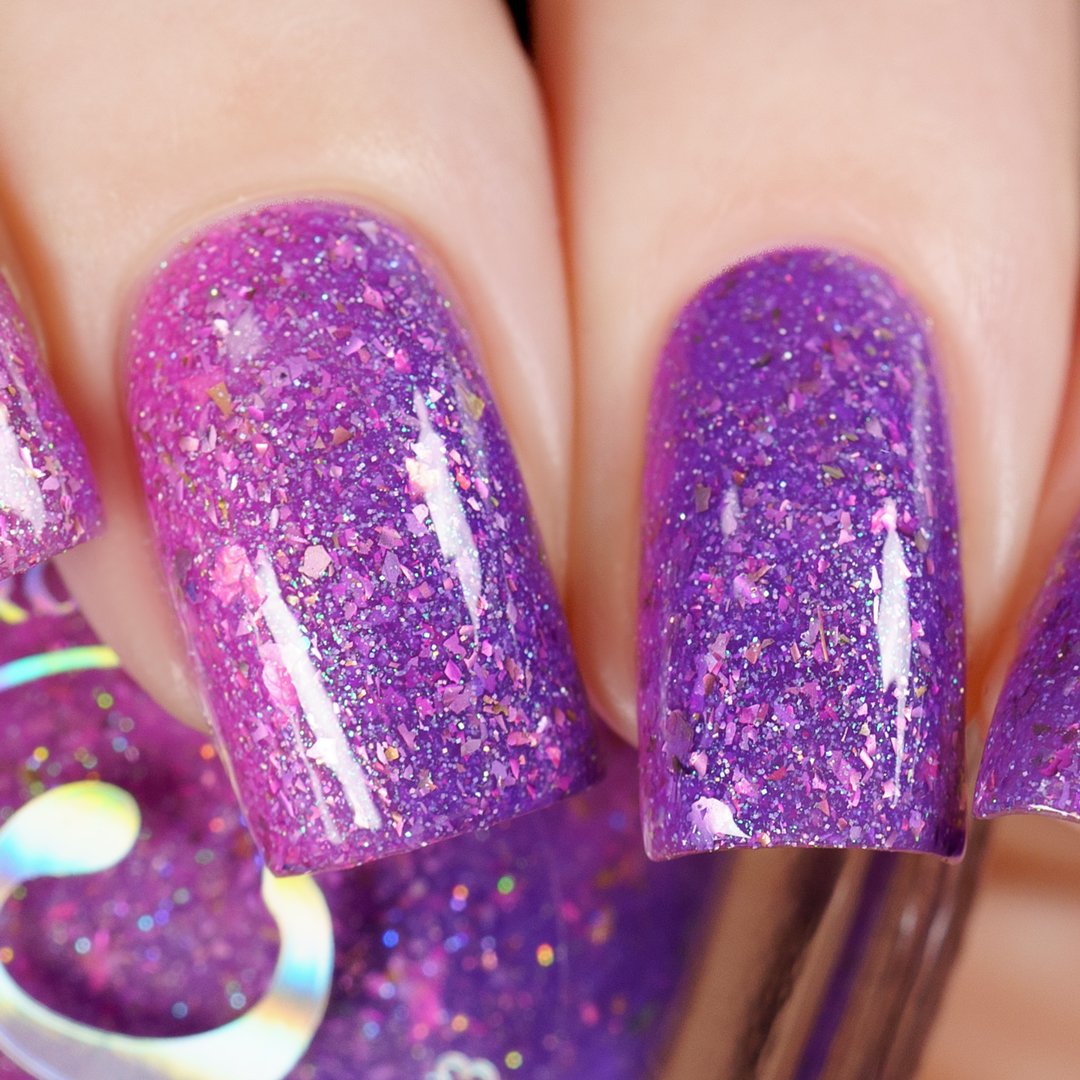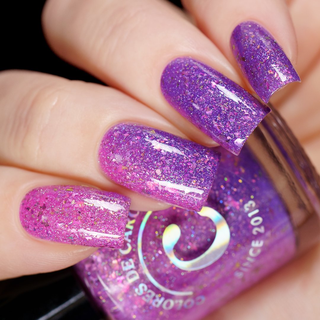 A playful solar nail polish that transforms with sunlight. Indoors, it appears as a soft pink base filled with sparkling shimmer and delicate flakes. Step into the sun and watch it shift into a vibrant purple, creating a magical color-changing effect that captures the joy of bright spring days.