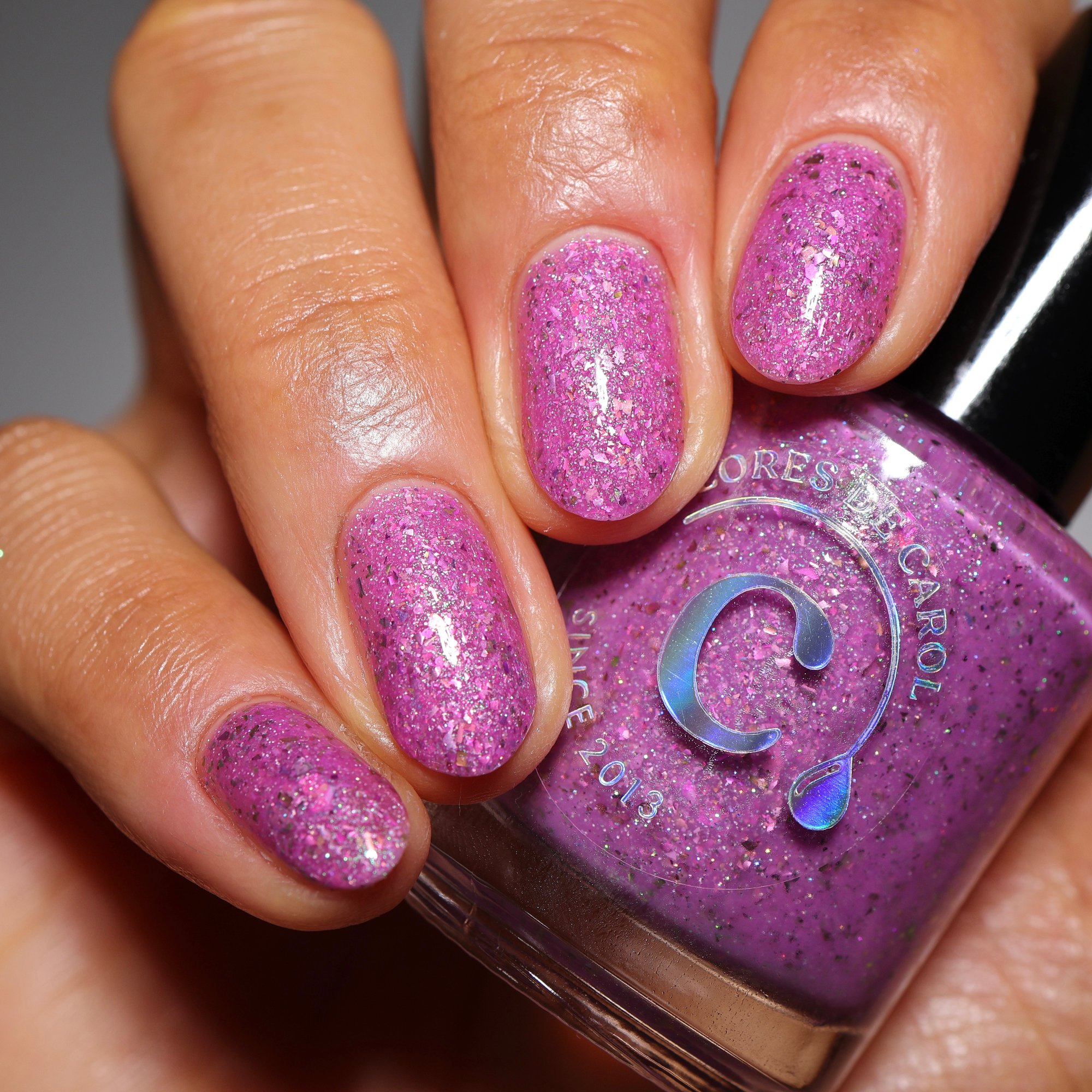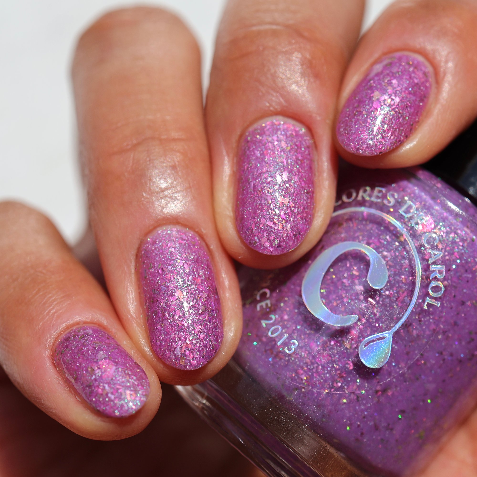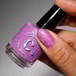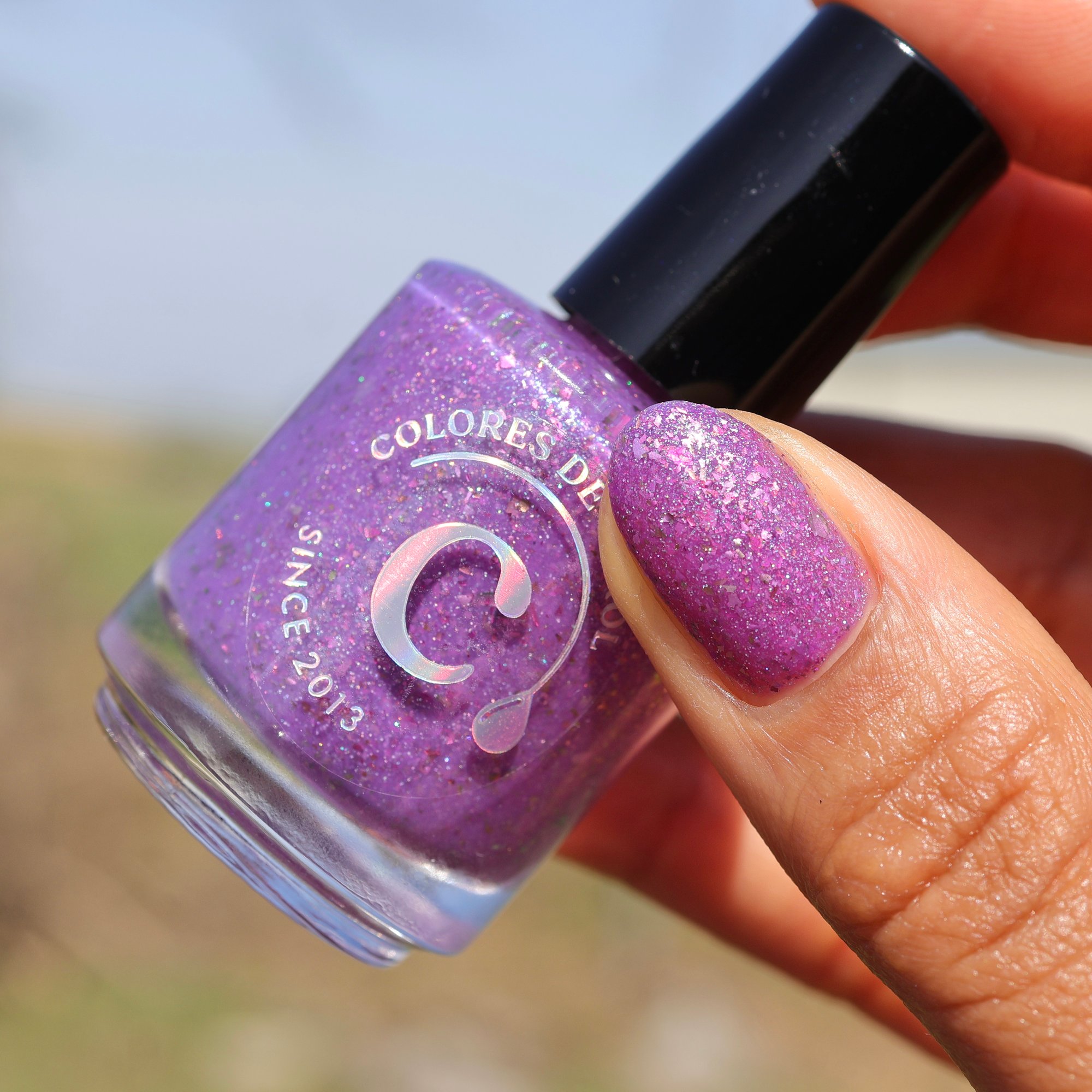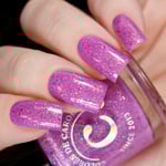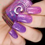 A playful solar nail polish that transforms with sunlight. Indoors, it appears as a soft pink base filled with sparkling shimmer and delicate flakes. Step into the sun and watch it shift into a vibrant purple, creating a magical color-changing effect that captures the joy of bright spring days.